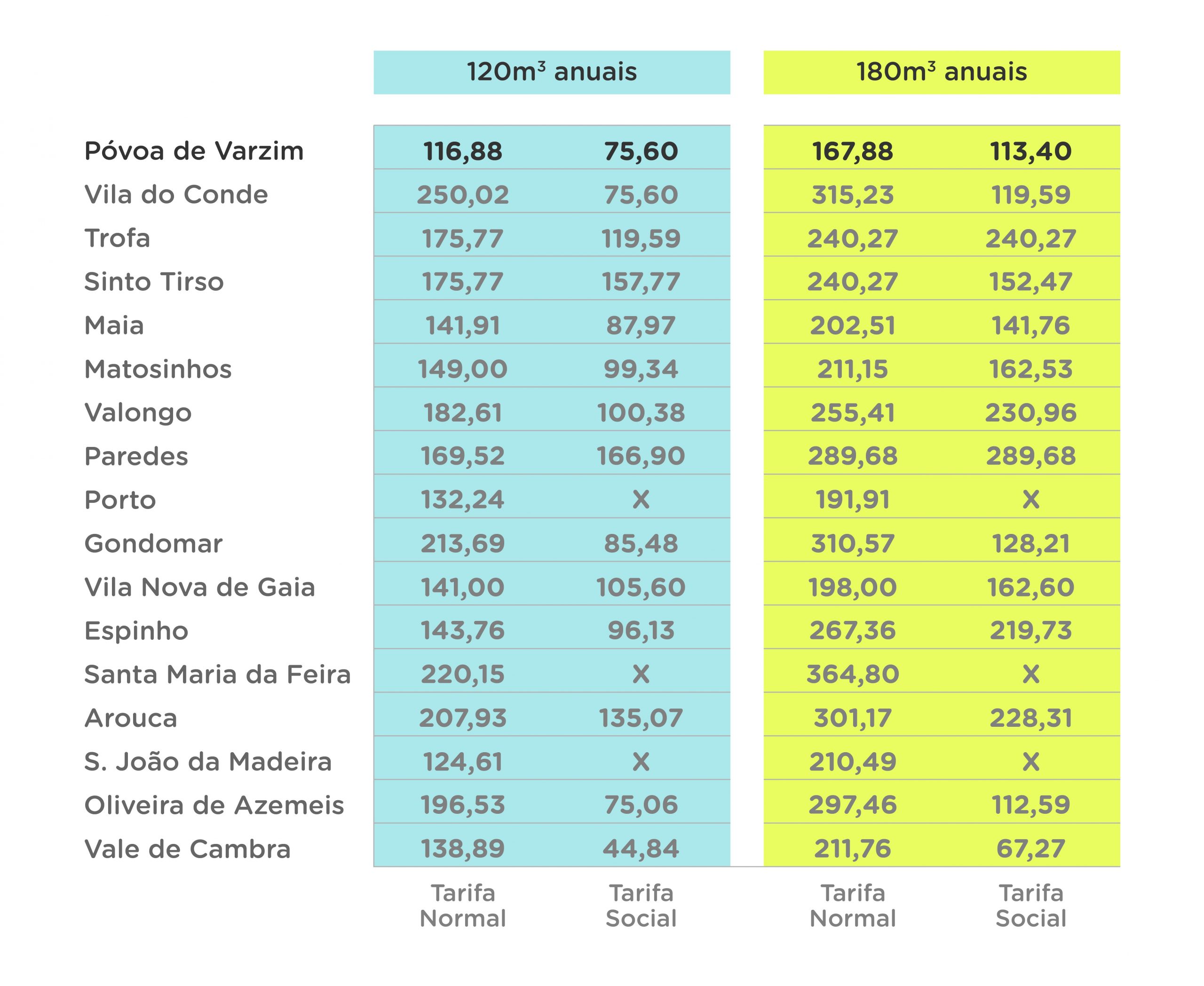 Importa referir que, mesmo quando o agregado apresenta um consumo maior face ao consumo padrão, o custo da água no concelho da Póvoa de Varzim continua a ser o mais baixo de toda a Área Metropolitana do Porto.