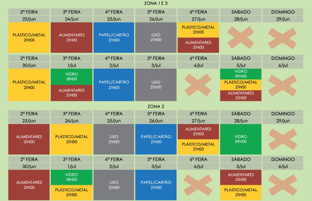 - Dia 27 de junho, às 21h00, haverá recolha de Plástico/Metal e Alimentares;