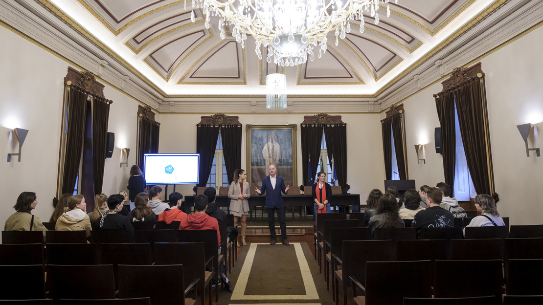Na sua intervenção, o Vice-Presidente e Vereador do Pelouro da Educação deu a conhecer o Salão Nobre aos jovens alunos e explanou um pouco da riquíssima história do concelho da Póvoa de Varzim e suas tradições.
