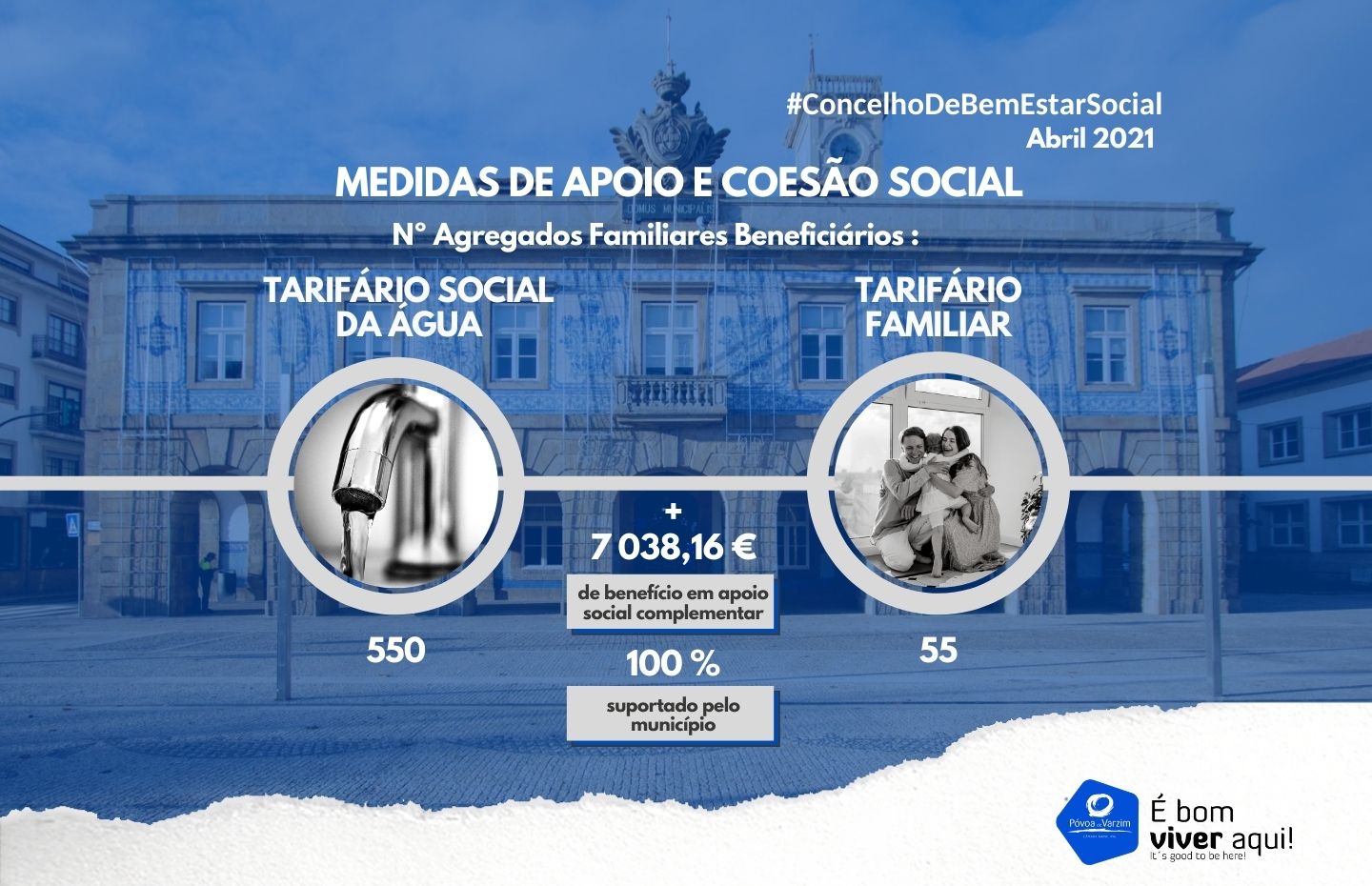 O Município da Póvoa de Varzim despendeu ainda, durante o mês de abril, de mais de 7 000,00€ em apoio a cerca de 600 agregados familiares beneficiários de tarifário social da água e de tarifário familiar.