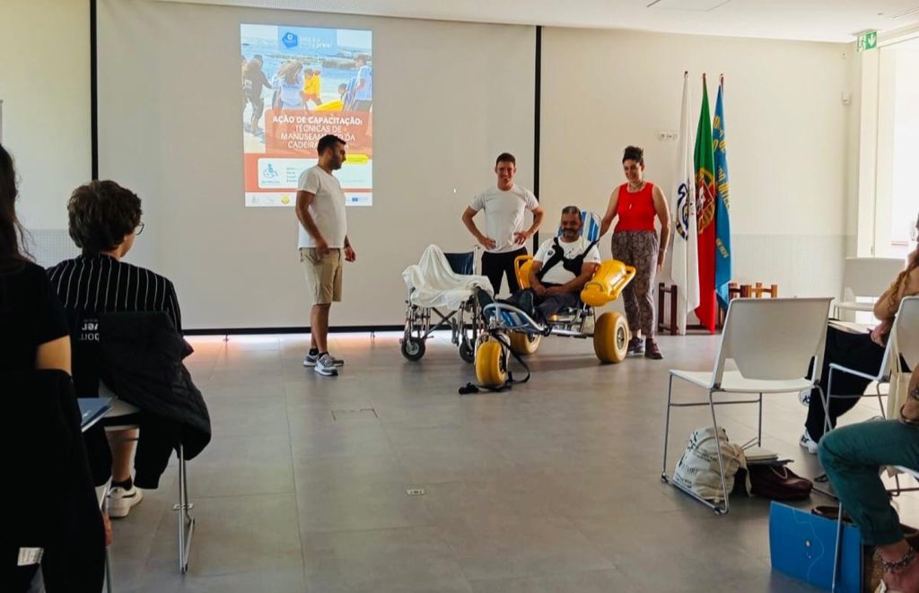 A primeira ação decorreu no dia 20 de junho, nas instalações do MAPADI, sob o tema “Técnicas de Manuseamento da Cadeira Anfíbia”. Ministrada por José Pedro Ramalho, esta formação capacitou os participantes com os conhecimentos técnicos necessários para garantir uma utilização segura e eficiente da cadeira anfíbia — equipamento essencial para permitir o acesso ao mar a pessoas com mobilidade condicionada. Esta ação contou com cerca de 20 monitores e voluntários.