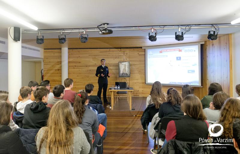 Numa sala com 90 alunos das Escolas Flávio Gonçalves e Eça de Queirós, o Comandante José Marques Coelho falou não só sobre a sua profissão, mas também atividade da Marinha, mostrando a importância da Autoridade Marítima e também alguns equipamentos e programas que são utilizados para a realização dos trabalhos.