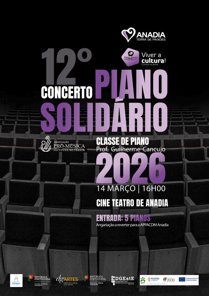 A Escola de Música da Póvoa de Varzim apresenta o 12.º Concerto Piano Solidário, uma iniciativa da classe de Piano do Prof. Guilherme Cancujo, que terá lugar no dia 14 de março, às 16h00, no Cineteatro de Anadia, em parceria com o Município de Anadia.