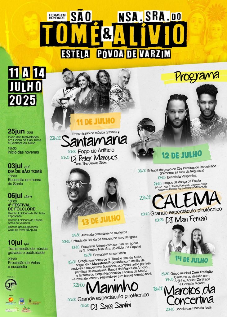 A Comissão de Festas de São Tomé e Nossa Senhora do Alívio organizou quatro dias de muita música e animação convidando grandes artistas da atualidade. Santa Maria (11/7), Calema (12/7) e Maninho (13/7) são os cabeça de cartaz que pelas 22h00 atuam na Estela e a que se seguem os DJ’s Peter Marques, Mari Ferrari e Sara Santini, respetivamente. O programa das festas termina com um espetáculo pelos Marotos da Concertina, a 14 de julho, pelas 18h00.