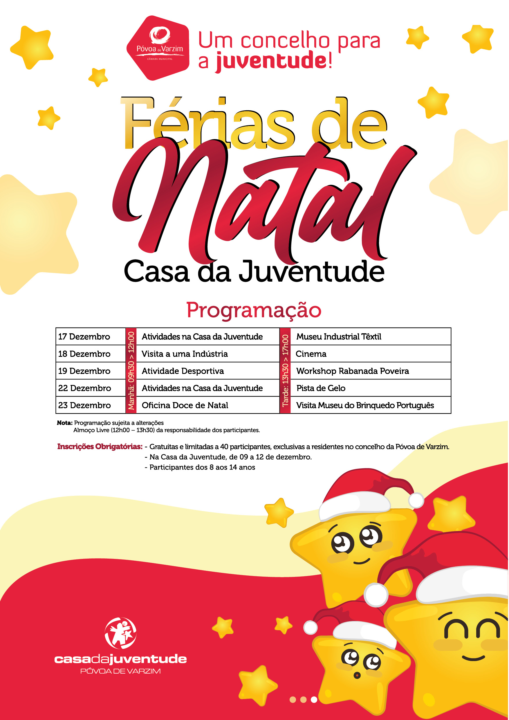 A programação irá realizar-se nos dias 17, 18, 19, 22 e 23 de dezembro, das 9h30 às 12h00 e das 13h30 às 17h00, e engloba atividades na Casa da Juventude, visitas ao Museu Industrial Têxtil e ao Museu do Brinquedo Português, sessões de cinema, pista de gelo, uma oficina “Doce de Natal” e um worskshop da Rabanada Poveira.