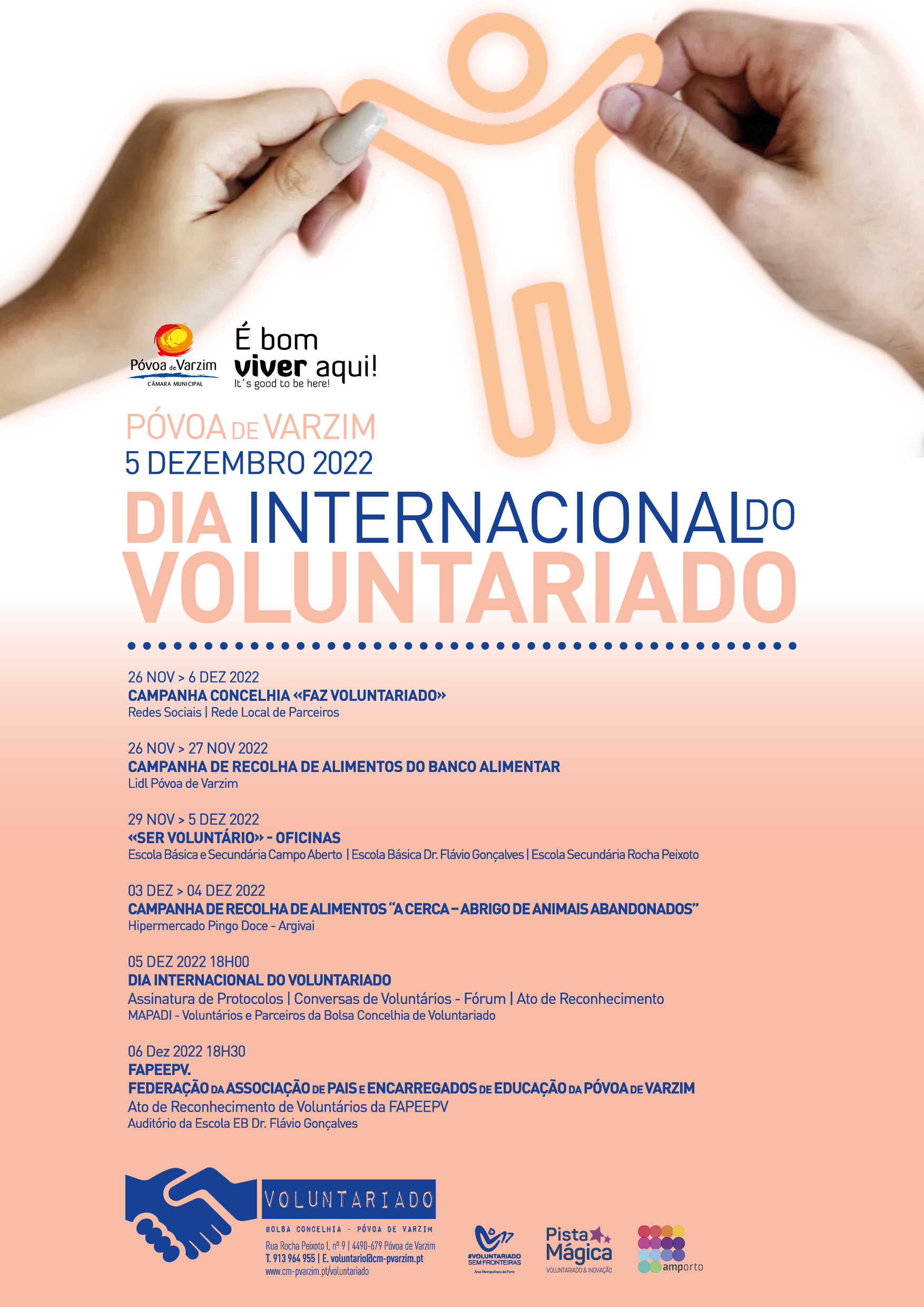 O Município da Póvoa de Varzim está a celebrar o Dia Internacional do Voluntariado – que se assinala por deliberação da Organização das Nações Unidas, desde 1985, no dia 5 de dezembro – com a realização de um grande programa de iniciativas, planeadas em conjunto com a rede local de entidades parceiras e destinadas a sensibilizar e capacitar pessoas para o voluntariado.