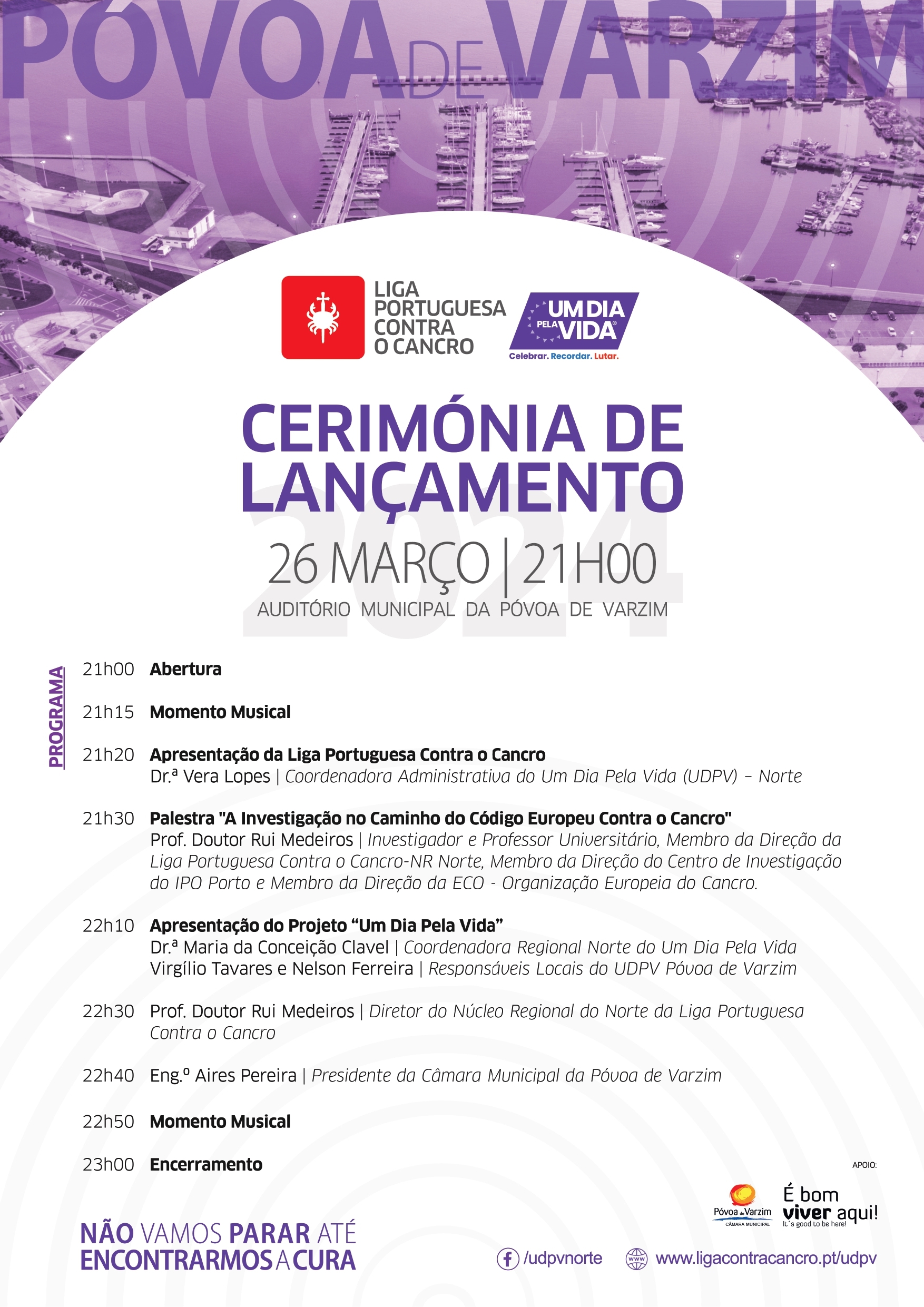 No dia 26 de março, às 21h00, o Auditório Municipal irá acolher a cerimónia de lançamento do Projeto "Um Dia pela Vida" (UDPV), promovido pela Liga Portuguesa Contra o Cancro, com o apoio da Câmara Municipal da Póvoa de Varzim.