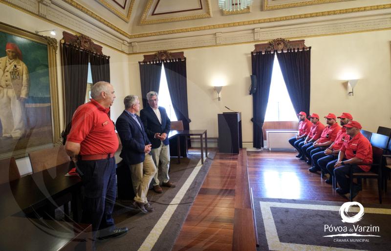 Os cinco membros que integram a recém-formada Equipa de Intervenção Permanente (EIP), acompanhados pelo Presidente da Real Associação Humanitária dos Bombeiros Voluntários da Póvoa de Varzim, Rui Coelho, visitaram os Paços do Concelho para serem formalmente apresentados ao Presidente da Câmara Municipal, Aires Pereira.