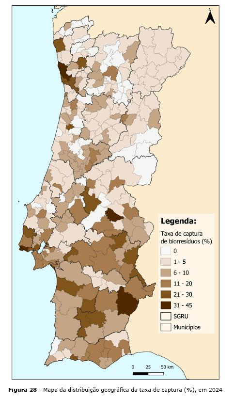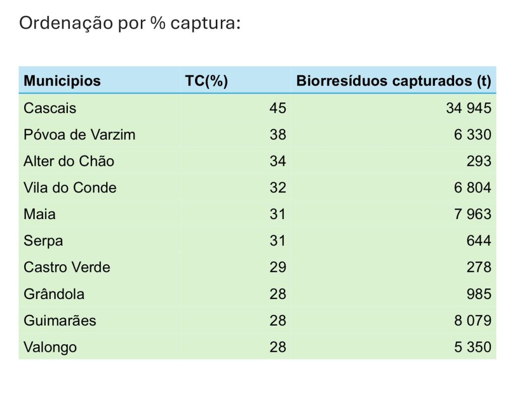 Segundo o Relatório Anual de Resíduos Urbanos (RARU) de 2024, apenas seis municípios apresentam taxas de captura de biorresíduos entre 31% e 45% — sendo a Póvoa de Varzim o segundo concelho com a melhor taxa (38%), apenas atrás de Cascais, que apresenta um número de 45%.