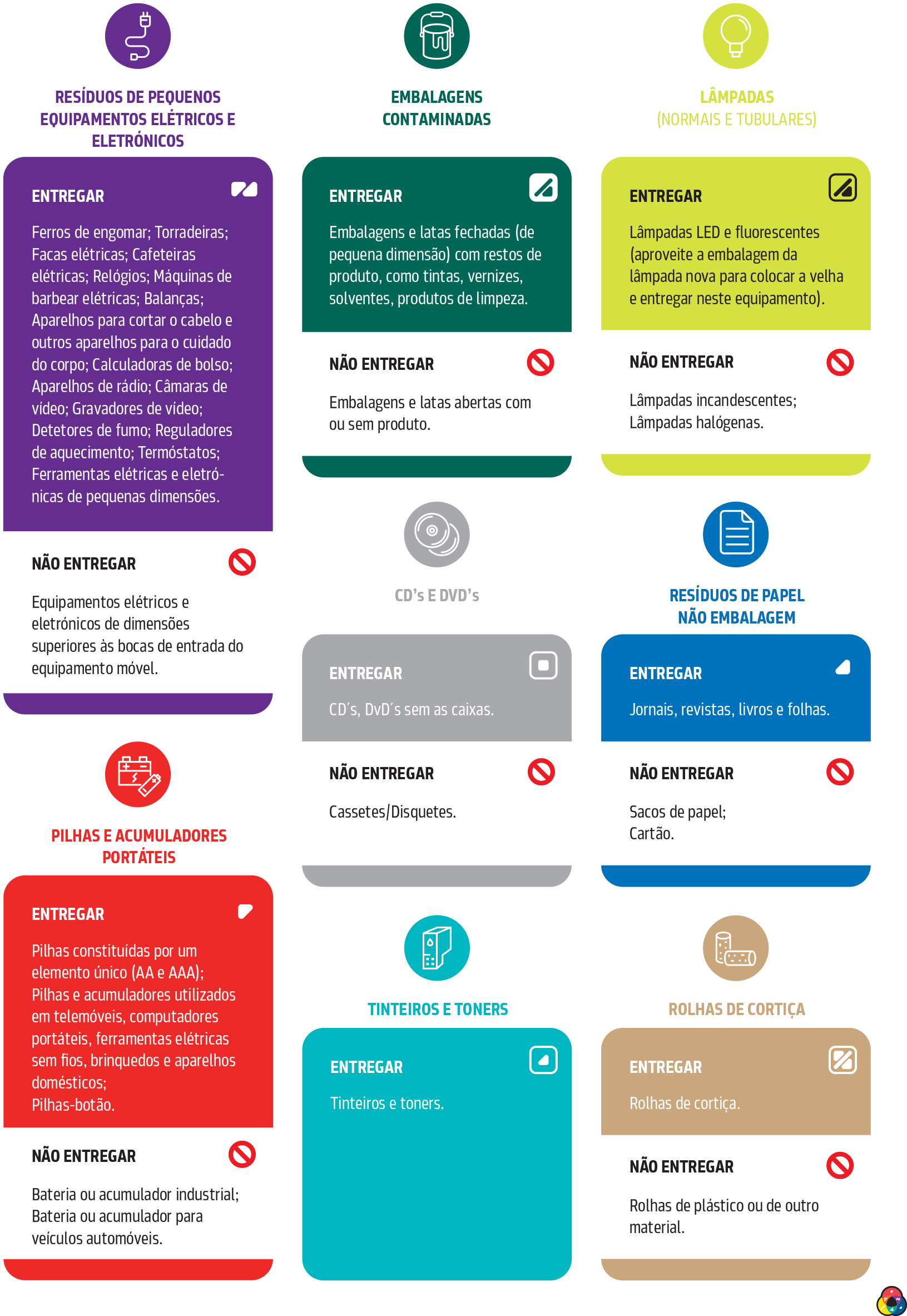 Nos Ecocentros Móveis poderá entregar materiais como Latas, Lâmpadas, Equipamentos Elétricos e Eletrónicos (REEE), CD’s, DvD’s, Pilhas e Pequenos Acumuladores, Tinteiros e Tonners, bem como Rolhas de Cortiça.