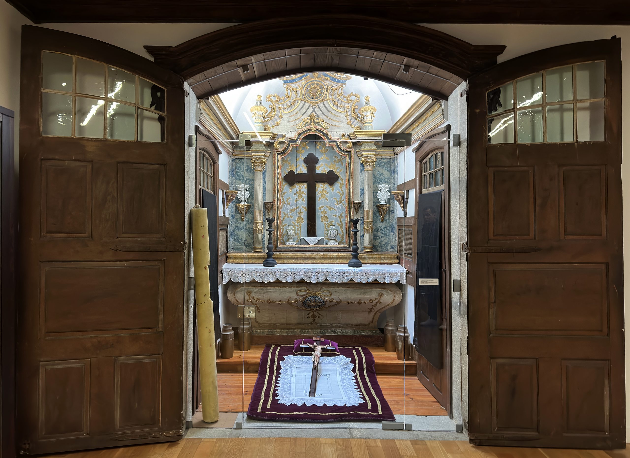 As portas duplas que protegem o “oratório” permitem, quando abertas, que toda a sala contígua seja utilizada como a “nave” de uma capela, ou, ao serem fechadas, protegem este lugar sagrado, facilitando o uso profano desta sala do andar nobre da casa.